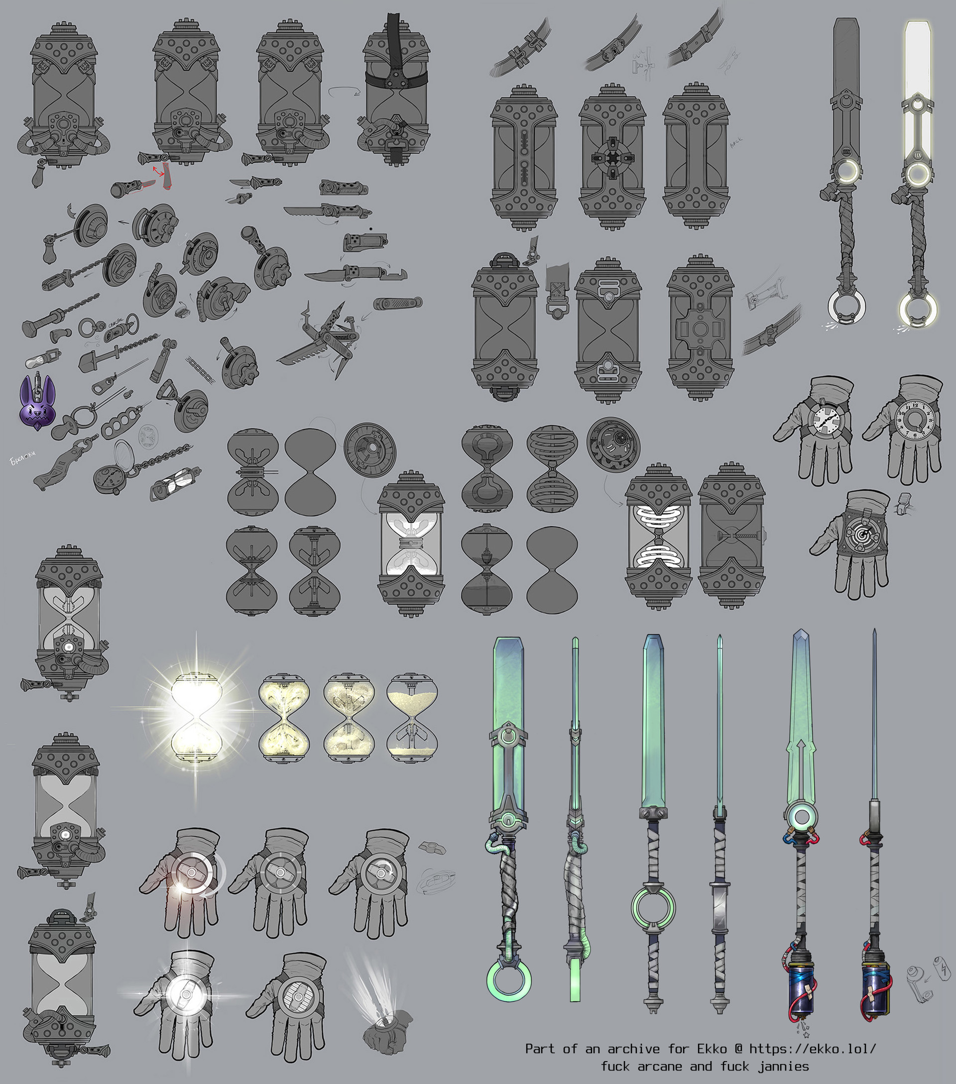 In Zaun, gadgets make the man. As a skilled inventor, Ekko has a few to call his own, entirely of his own design. Every device his carries is a product of his own mind, built by him and him alone with nothing but scrap, sweat, and brilliance. Every gadget is a testament to Zaunite ingenuity and resourcefulness: rough, salvaged, and undeniably his.
